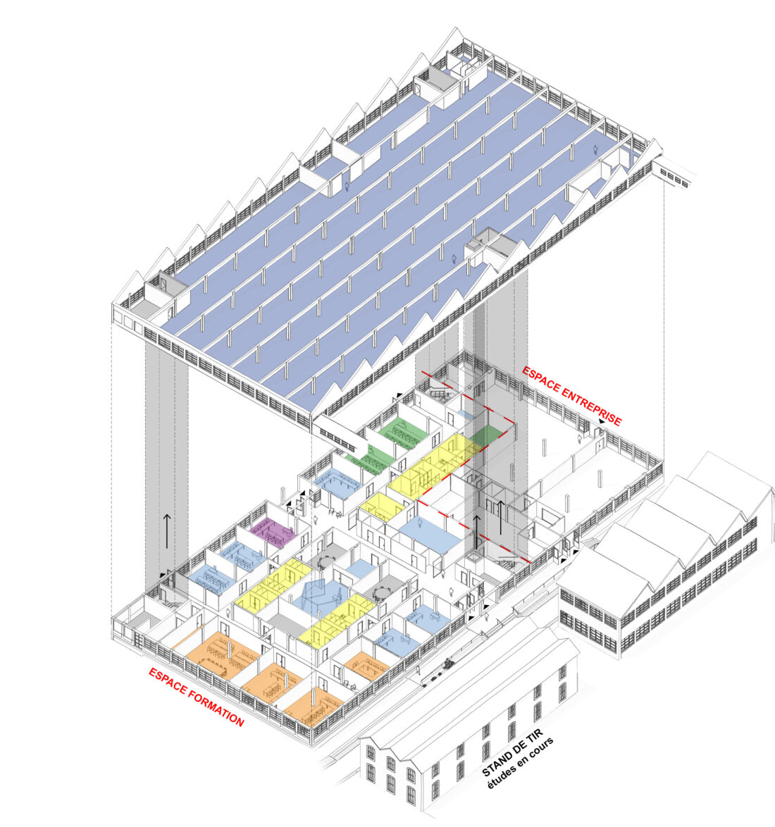 Le projet consiste en le réaménagement d’une ancienne papeterie en centre de formation aux métiers de la sécurité et de la sûreté comprenant au RDC: des salles de formation, dojo, simulateur de tir, stands de tir et un plateau technique de mise en situation à l’étage. L’Etablissement Public Foncier Grand Est a engagé des travaux de requalification de l’ensemble du site. (Mise en sécurité et Clos Couvert des bâtiments par l’équipe de MOE H.V.S – L.HEINRICH Mandataire). La Communauté d’Agglomération de Saint-Dié-des-Vosges intervient en réhabilitation intérieure du Bâtiment Saint Louis ainsi que pour les travaux de réseaux et voiries liés au programme.