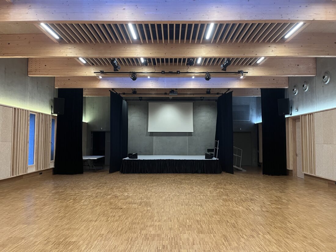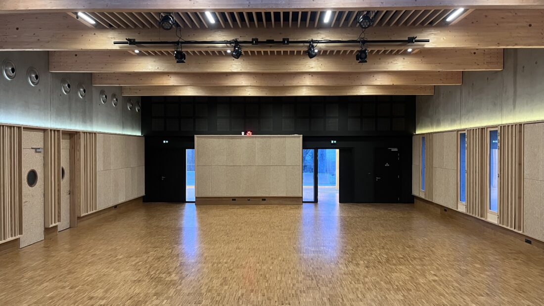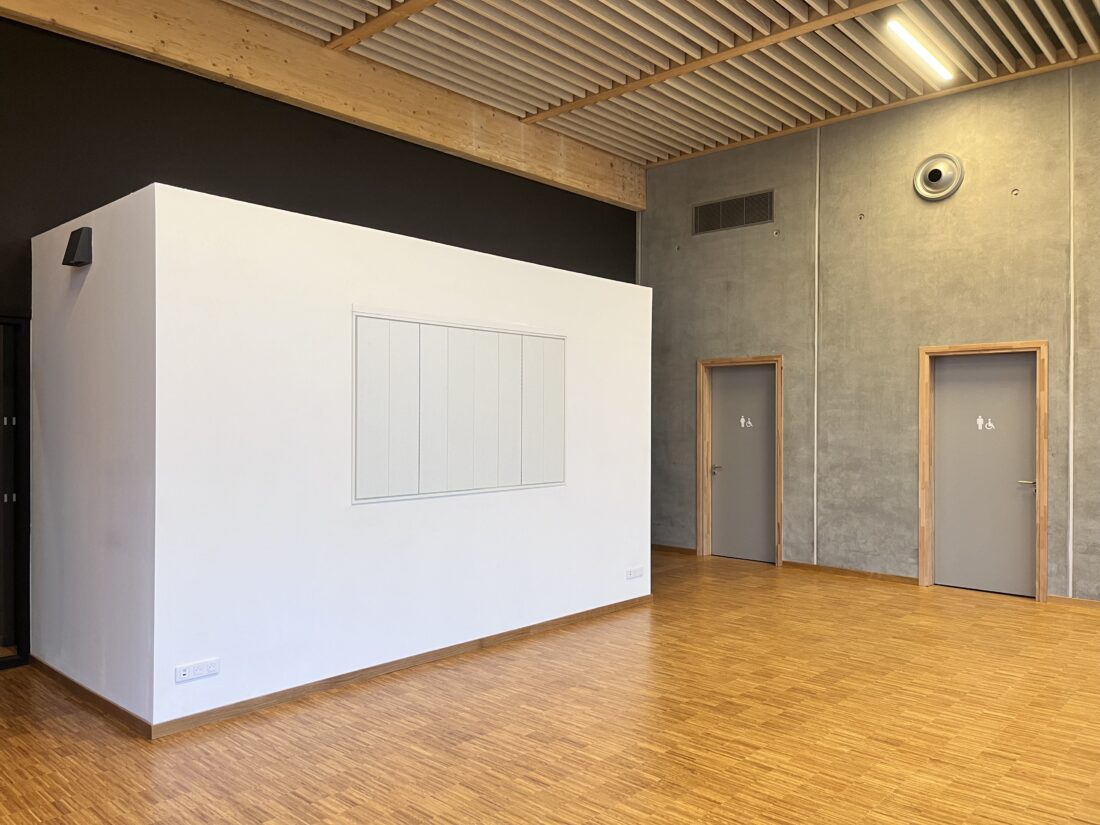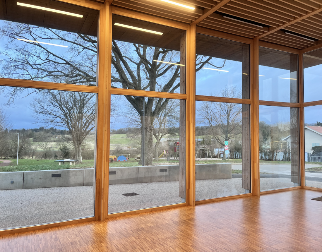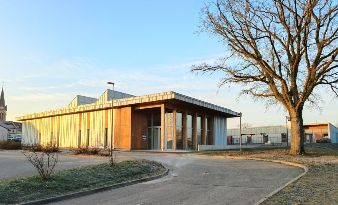 La salle des fêtes est construite en cœur de village. Avec l’école, elle constitue un ensemble qui met en œuvre des systèmes constructifs similaires: ossature bois/béton, bardage zinc, menuiseries bois aluminium, aménagements intérieurs bois avec structure apparente. L’accès à la nouvelle salle se fait par un hall d’entrée largement vitré côté Nord qui permet d’offrir une large vue sur le paysage arboré lointain (foret) et proche (chêne « remarquable »).